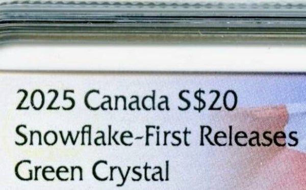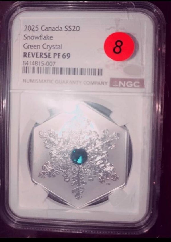 2025 Canadian Mint Frosted Maple Leaf Snowflake hexagon 1 Troy Oz Silver Bullion Coin PCGS69 Green Glass Crystal in the middle of the Coin Stunning show stopper